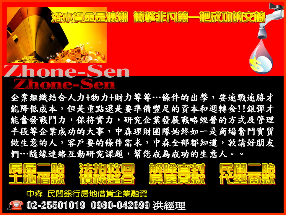活水資金是浪潮 衝擊非凡第一把成功的交椅Zhone-Sen中森借貸網企業組織結合人力+物力+財力等等…條件的出撃,要速戰速勝才能降低成本,但是重點還是要準備豐足的資本和週轉金!!銀彈才能奮發戰鬥力,保持實力,研究企業發展戰略經營的方式及管理手段等企業成功的大事,中森理財團隊始終如一是商場奮鬥實質做生意的人,客戶要的條件需求,中森全部都知道,敦請好朋友們…隨緣連絡互動研究課題,幫您成為成功的生意人。。房屋二胎,法拍救回,解除查封,民間二胎,土地借款,債務整合,房屋貸款,代墊商款,中森 民間銀行房地借貸企業融資02-25501019 0980-042699洪經理