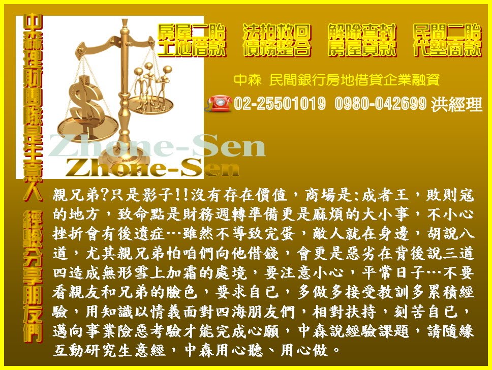 房屋二胎,法拍救回,解除查封,民間二胎,土地借款,債務整合,房屋貸款,代墊商款,中森 民間銀行房地借貸企業融資02-25501019 0980-042699洪經理中森理財團隊是生意人 經驗分享朋友們