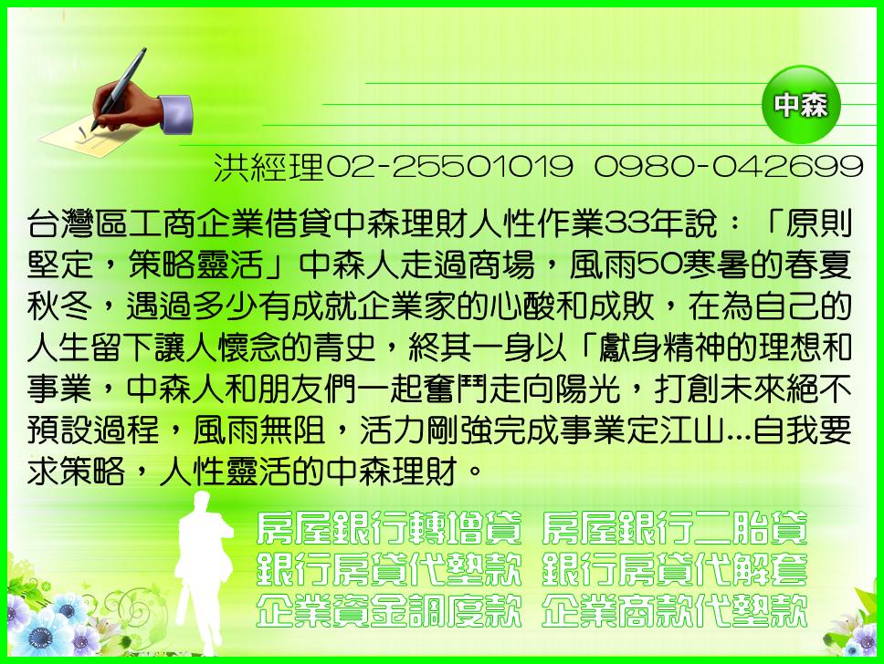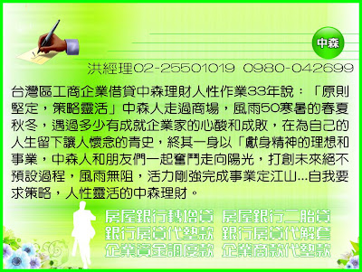 台灣區工商企業借貸中森理財人性作業33年說:「原則堅定,策略靈活」中森人走過商場,風雨50寒暑的春夏秋冬,遇過多少有成就企業家的心酸和成敗,在為自己的人生留下讓人懷念的青史,終其一身以「獻身精神的理想和深謀遠慮的承擔現實」貫徹偉大理想想和事業,中森人和朋友們一起奮鬥走向陽光,打創未來絕不預設過程,風雨無阻,活力剛強完成事業定江山…自我要求策略,人性靈活的中森理財。