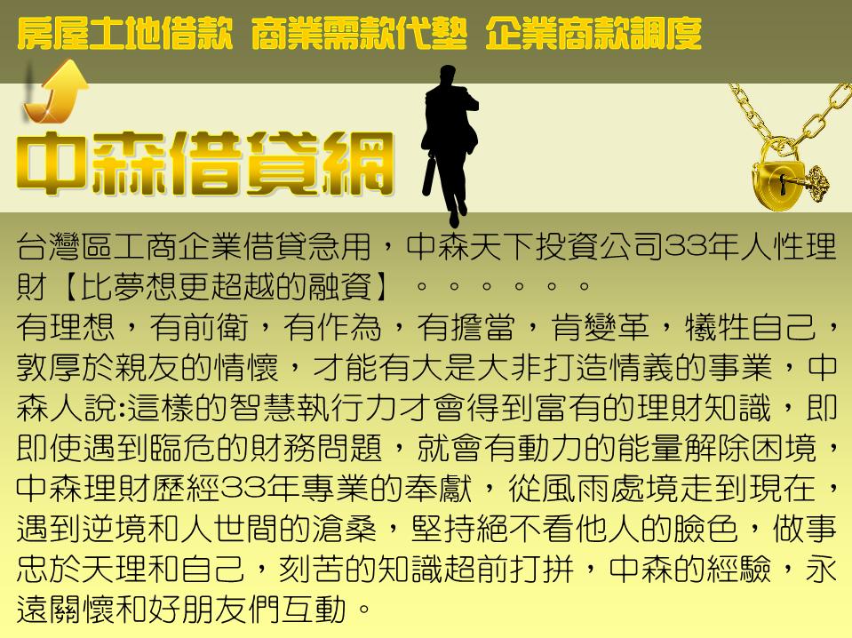 台灣區工商企業借貸急用,中森天下投資公司33年人性理財【比夢想更超越的融資】。。。。。。