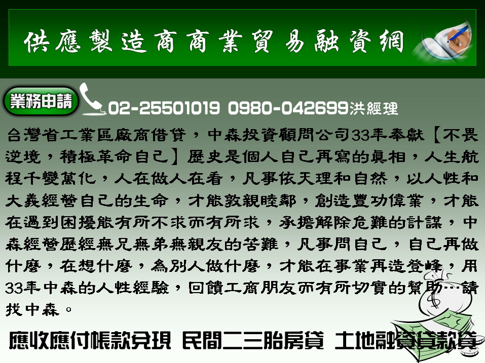台灣省工業區廠商借貸,中森投資顧問公司33年奉獻【不畏逆境,積極革命自己】歷史是個人自己再寫的真相,人生航程千變萬化,人在做人在看,凡事依天理和自然,以人性和大義經營自己的生命,才能敦親睦鄰,創造豐功偉業,才能在遇到困擾能有所不求而有所求,承擔解除危難的計謀,中森經營歷經無兄無弟無親友的苦難,凡事問自己,自己再做什麼,在想什麼,為別人做什麼,才能在事業再造登峰,用33年中森的人性經驗,回饋工商朋友而有所切實的幫助…請找中森。