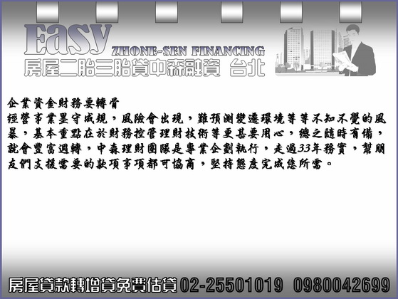經營事業墨守成規,風險會出現,難預測變遷環境等等不知不覺的風暴,基本重點在於財務控管理財技術等更甚要用心,總之隨時有備,就會豐富週轉,中森理財團隊是專業企劃執行,走過33年務實,幫朋友們支援需要的款項事項都可協商,堅持態度完成您所需。