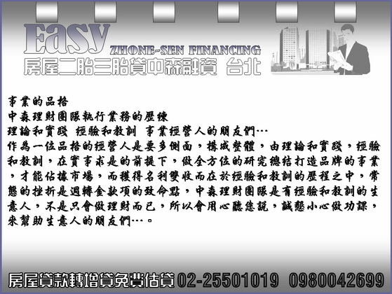 作為一位品格的經營人是要多側面,構成整體,由理論和實踐,經驗和教訓,在實事求是的前提下,做全方位的研究總結打造品牌的事業,才能佔據市場,而穫得名利雙收而在於經驗和教訓的歷程之中,常態的挫折是週轉金款項的致命點,中森理財團隊是有經驗和教訓的生意人,不是只會做理財而已,所以會用心聽您說,誠懇小心做功課,來幫助生意人的朋友們…。