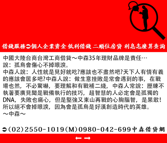 中國大陸台商台灣工商借貸~中森35年理財品牌是責任…說:孤鳥會傷心不掉眼淚。