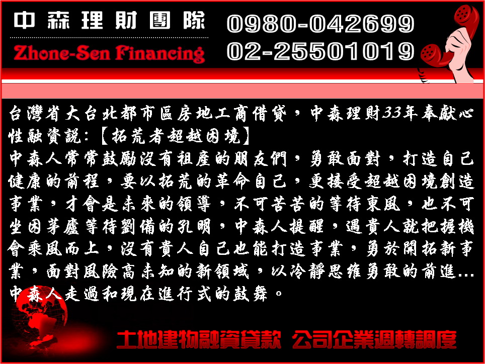 台灣省大台北都市區房地工商借貸,中森理財33年奉獻心性融資說:【拓荒者超越困境】